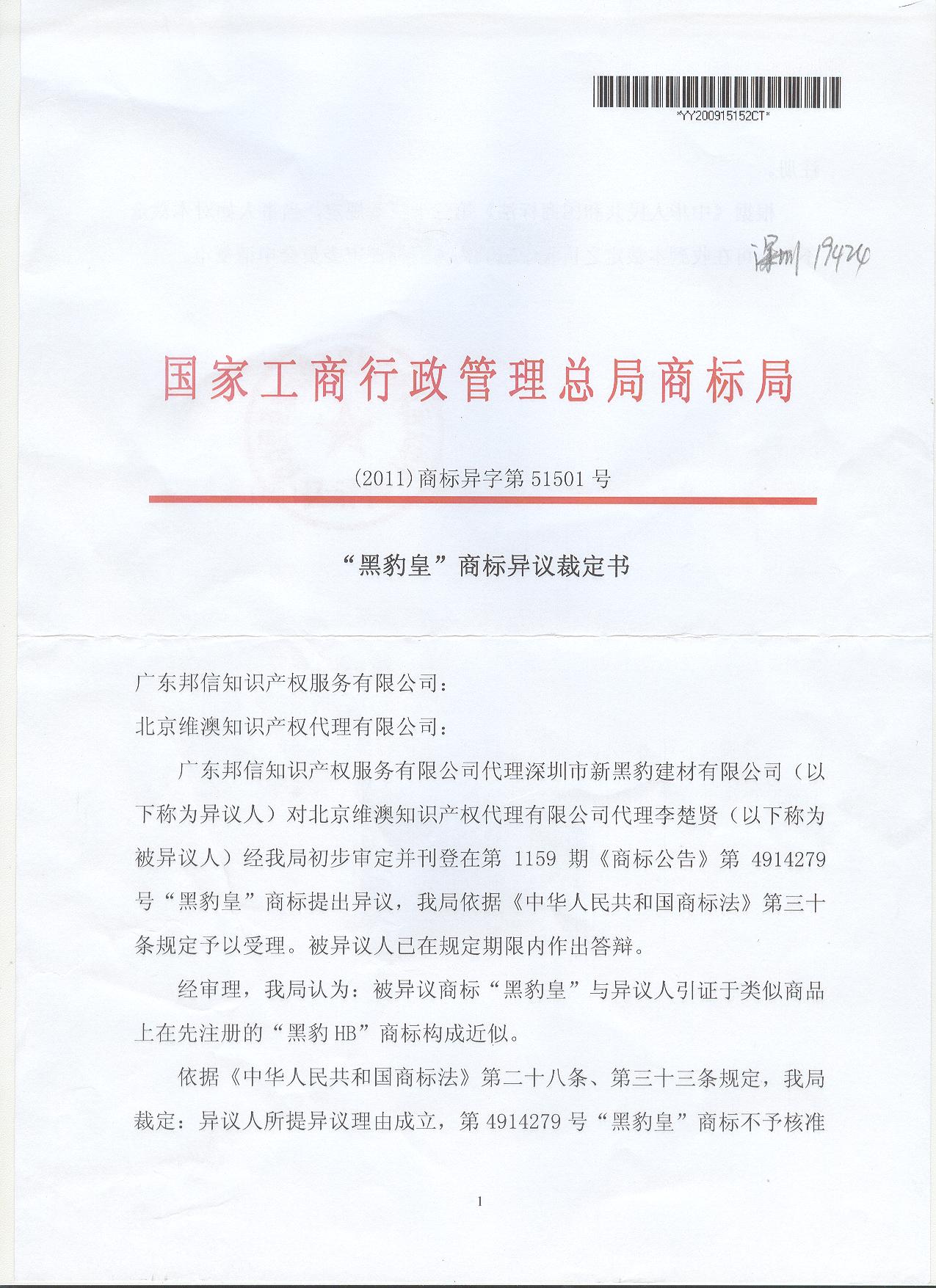 近期,因商標(biāo)“黑豹皇”與我公司的廣東省著名商標(biāo)“黑豹”構(gòu)成近似,經(jīng)國家工商行政管理局商標(biāo)總局裁定不予核準(zhǔn)注冊。(附:“黑豹皇”商標(biāo)異議裁定書)