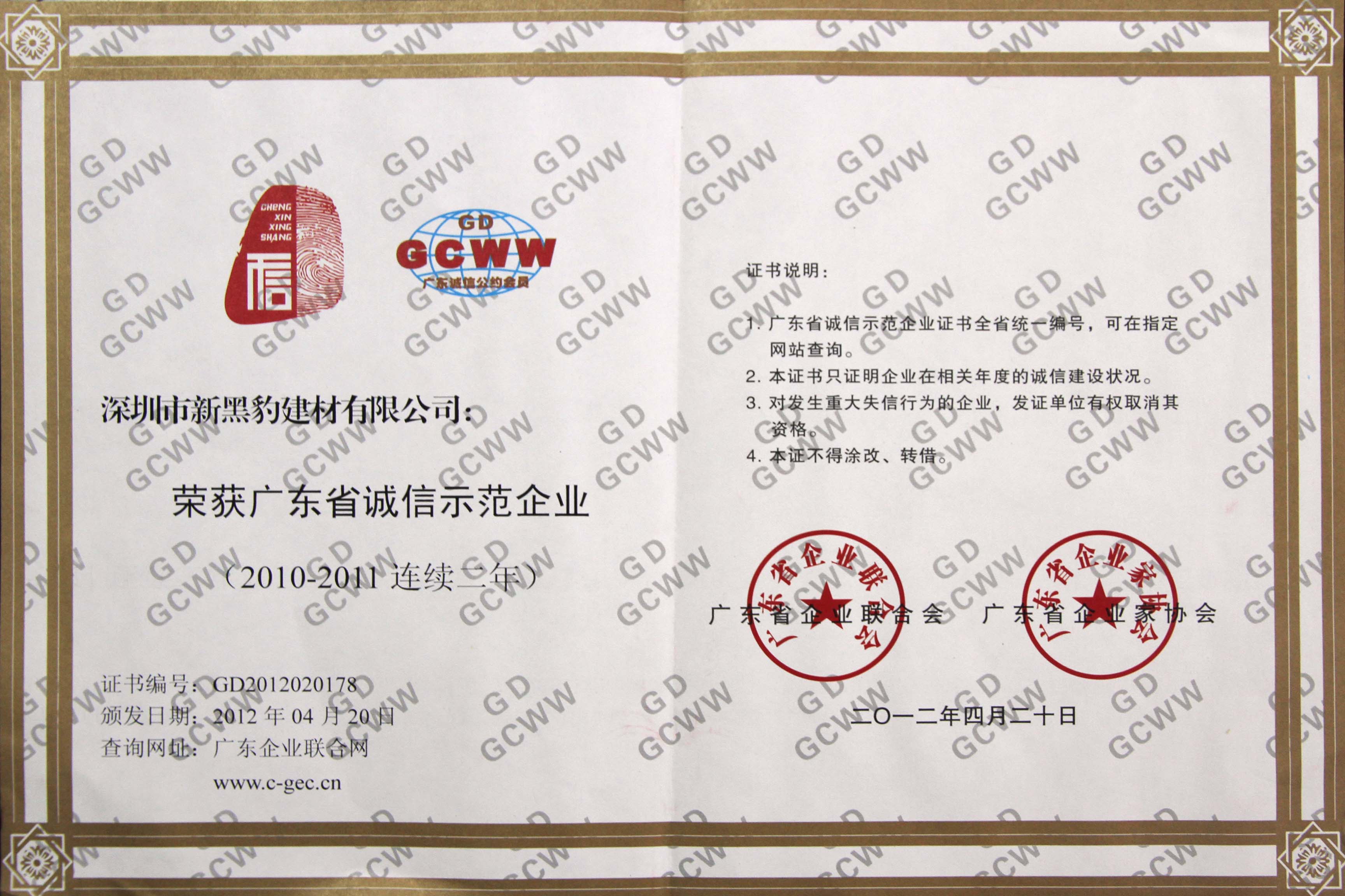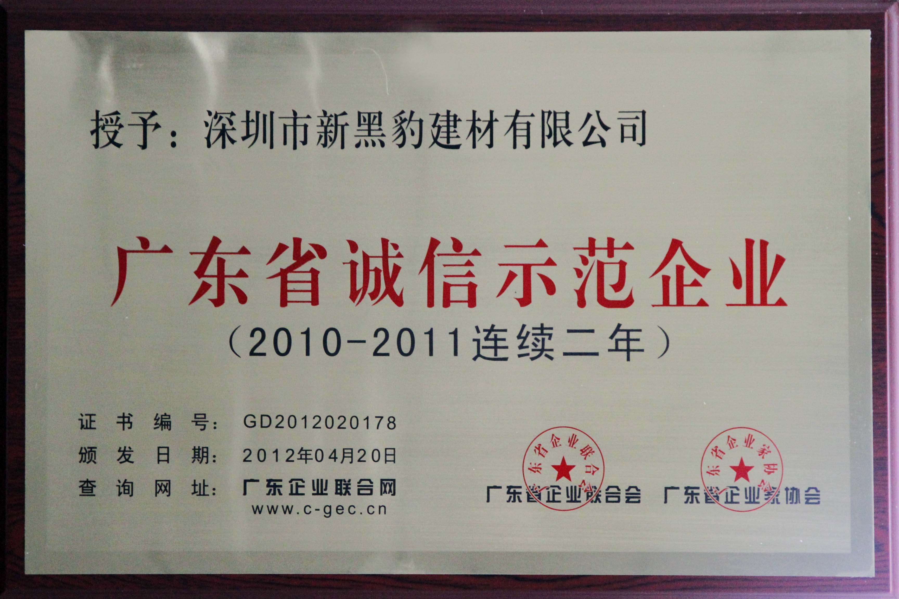 為深入貫徹落實黨的十七屆六中全會和省委十屆十一次全會精神,促進(jìn)我省企業(yè)和企業(yè)家在“十二五”時期加快轉(zhuǎn)型升級,建設(shè)幸福廣東,構(gòu)建全省企業(yè)誠信體系以及發(fā)揮雇主組織有效參與社會管理的作用,廣東省企業(yè)聯(lián)合會、廣東省企業(yè)家協(xié)會決定對為廣東經(jīng)濟社會發(fā)展作出突出貢獻(xiàn)的2011年度廣東省優(yōu)秀企業(yè)、優(yōu)秀企業(yè)家、最佳誠信企業(yè)、誠信示范企業(yè)、先進(jìn)雇主組織予以表彰。 經(jīng)認(rèn)真評選推薦和總隊嚴(yán)格審核,深圳市新黑豹建材有限公司光榮的獲得了“2011年度廣東省誠信示范企業(yè)”榮譽稱號!