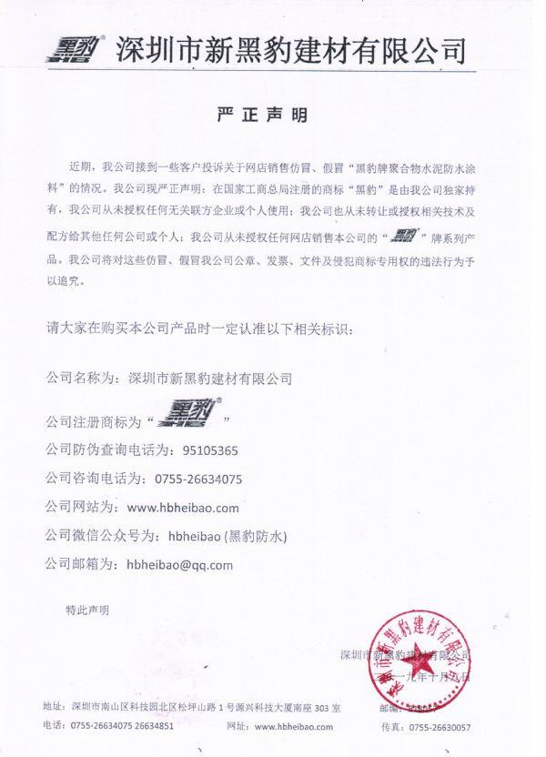公司防偽查詢電話為:95105365 公司咨詢電話為:0755-26634075 公司網(wǎng)站為:www.sustech1.cn 公司微信公眾號為:hbheibao (黑豹防水) 公司郵箱為:hbheibao@qq.com 特此聲明 深圳市新黑豹建材有限公司 二0一九年十月八日