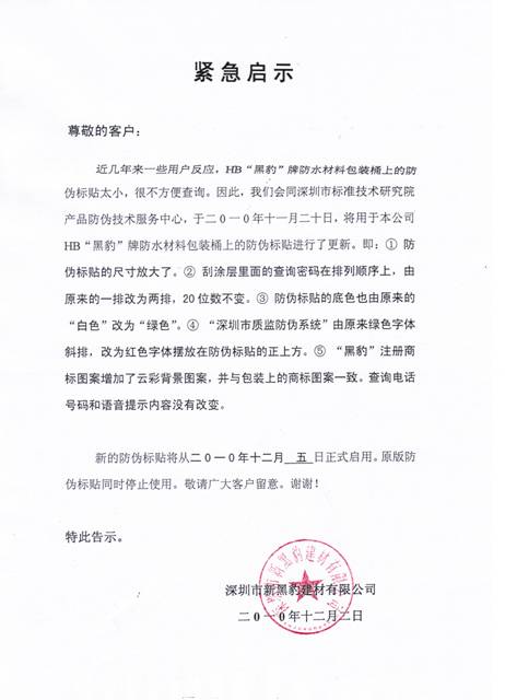 黑豹”牌防水材料包裝桶上的防偽標(biāo)貼進(jìn)行了更新